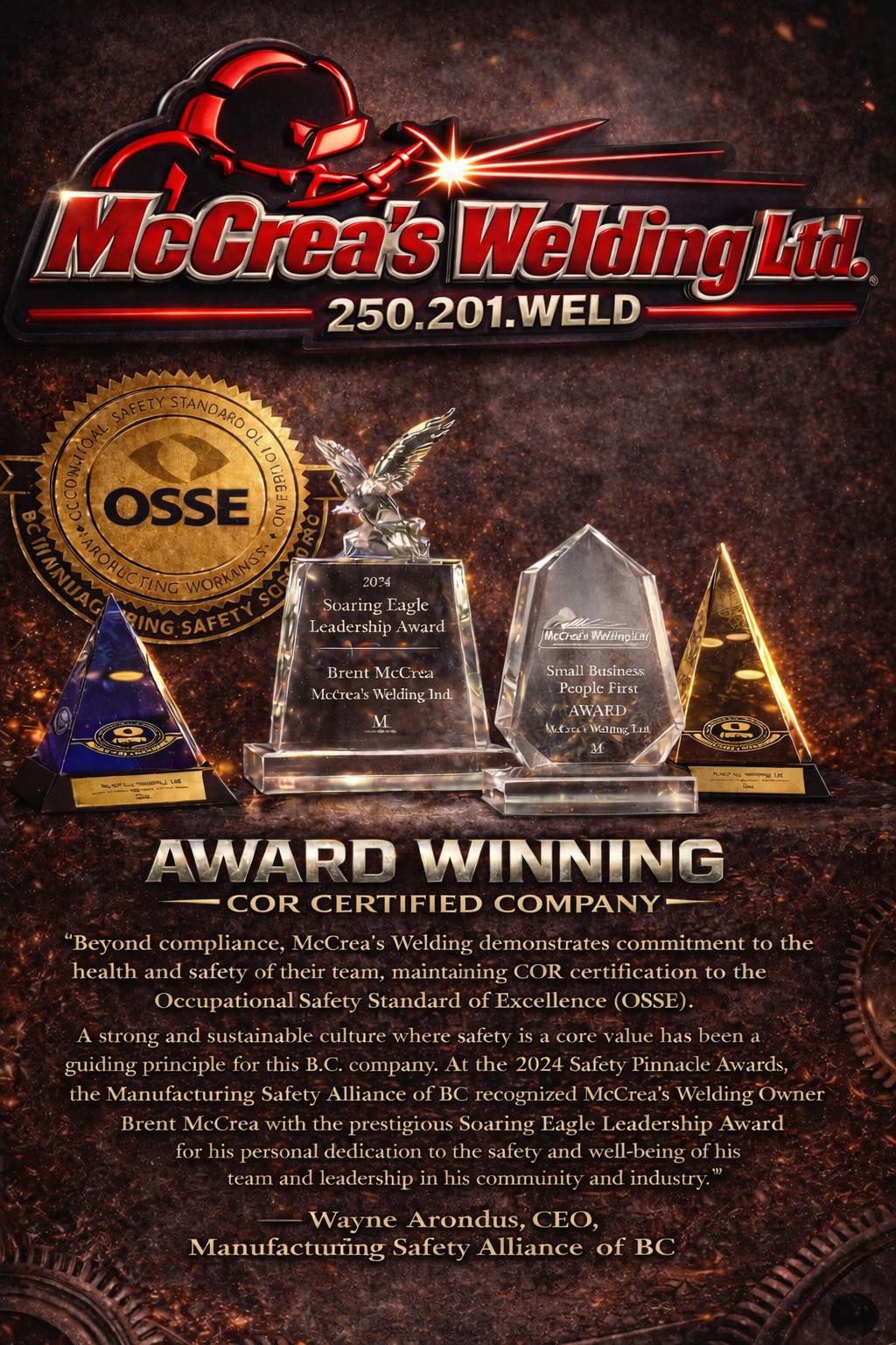 At McCrea’s Welding Ltd., safety is not a standalone policy, it is a daily practice. Through continuous improvement, strong partnerships, and engaged leadership, we are committed to maintaining a workplace where everyone goes home safely at the end of the day.